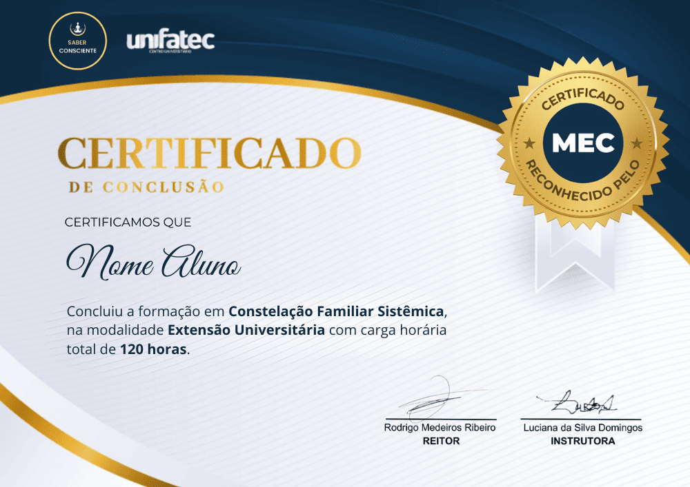 Ao concluir o curso você receberá dois Certificados. Um reconhecido pela ATH – Associação dos Terapeutas Holísticos  e e pela ABRAPH – Academia Brasileira de Psicoterapia Holística. Outro de extensão universitária reconhecido pelo MEC e emitido pela faculdade UNIFATEC.