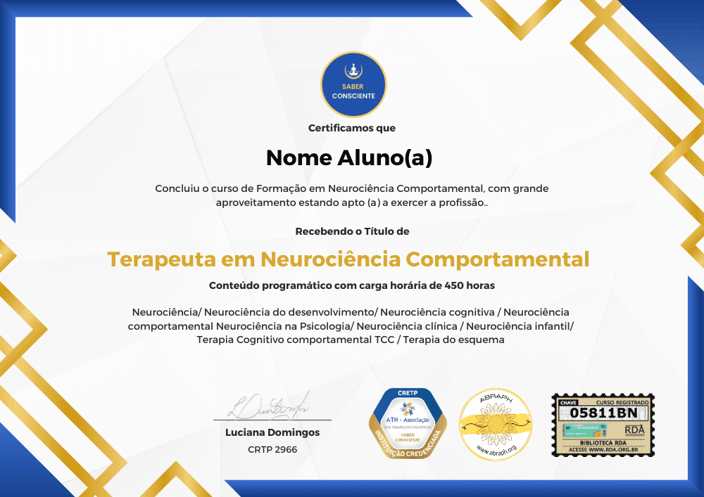Ao concluir o curso e atingir pelo menos nota 60 na avaliação, você receberá no e-mail 1 (um) certificado como Terapeuta em Neurociência Comportamental, com todo conteúdo descrito. É necessário concluir 100% do curso para solicitar o certificado.